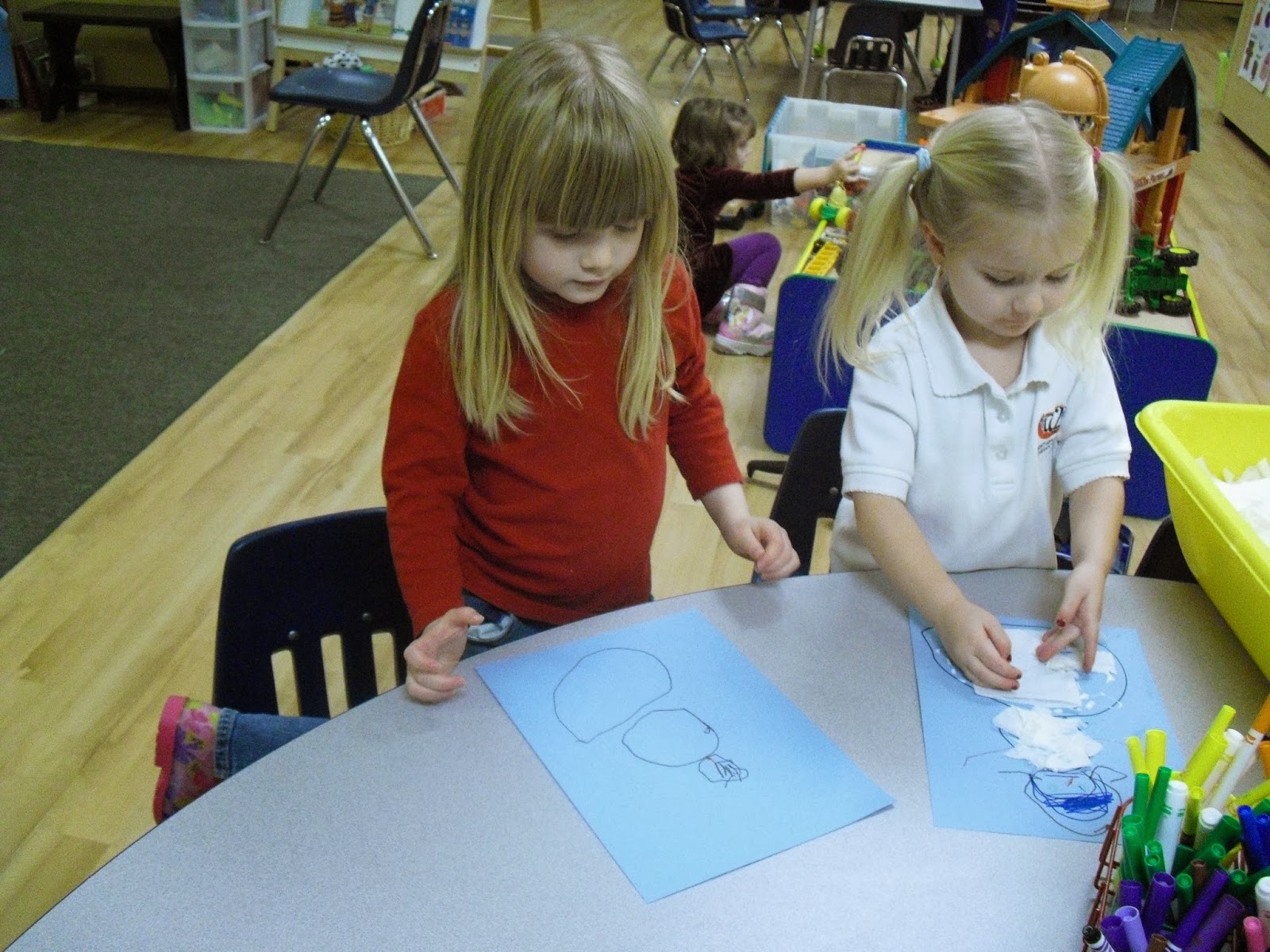 We used our torn tissue and we made snowmen. We drew 3 circles, a large circle on the bottom, a medium circle in the middle, and a small circle on top. Then we used the markers to make a face for our snowmen, and arms, then we spread glue around the middle and large circle and added our torn tissue. When we use markers or crayons we are working on holding the writing utensil the proper way, not with our fists. These projects are helping us learn process by following more than 3 step directions.